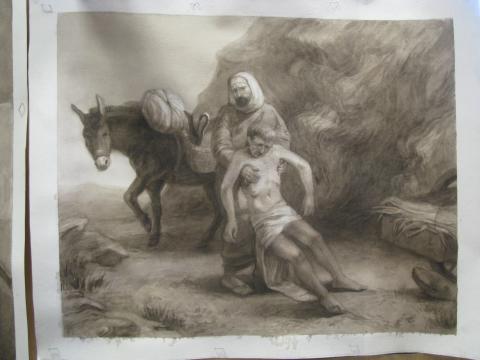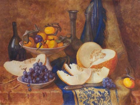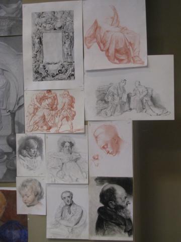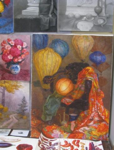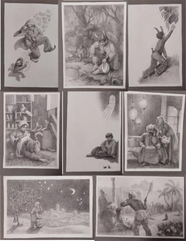 По композиции - разработка иллюстраций к произведению Вильгельма Гауфа "Маленький Мук" - карандаш. Множество набросков, постановочные натюрморты в графике и акварели.