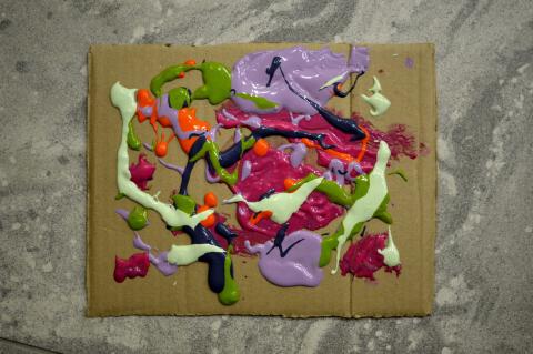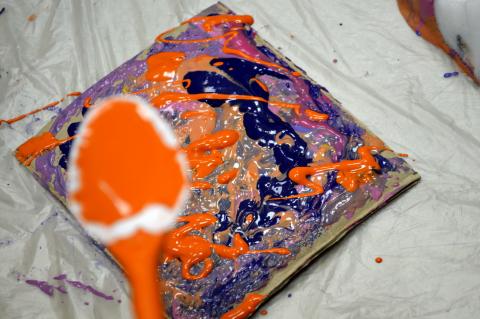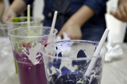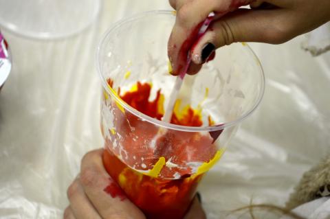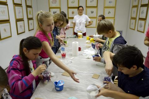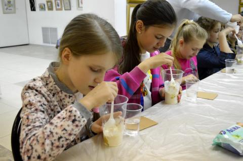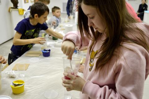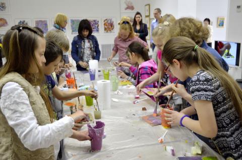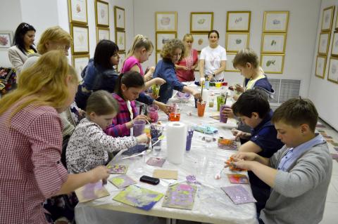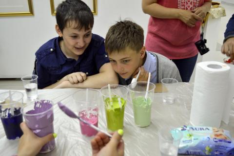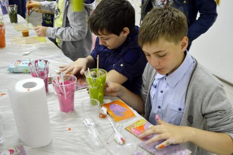 Во время мастер-класса мальчики и девочки из детской художественной школы научились самостоятельно готовить краски, наводить колер, смешивать цвета, создавать узоры и формы, не ограничивая себя никакими правилами и инструментами для изображения – в создании картины участвовали кисти, губка, ложки, палочки и даже пальцы.