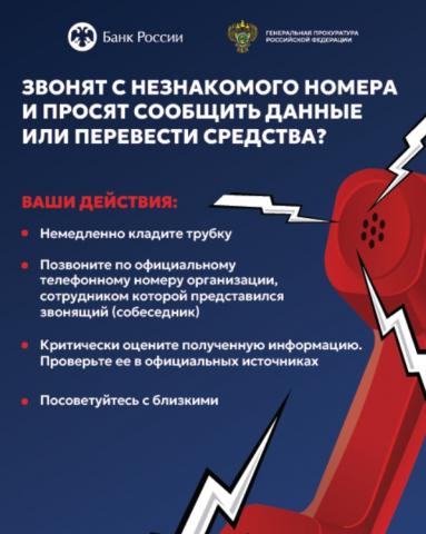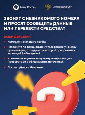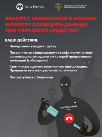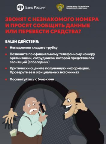 Ввиду возрастания угроз преступных посягательств в обозначенной сфере Генеральной прокуратурой Российской Федерации совместно с Банком России разработаны цифровые плакаты (прилагаются) в целях повышения уровня информированности населения о действиях лиц,