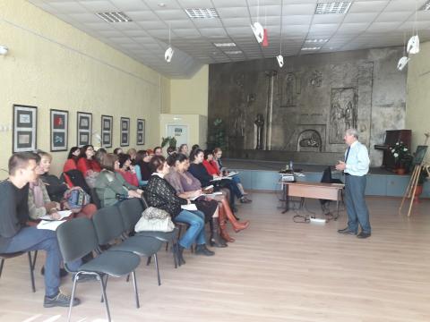 10-11 октября в рамках курсов повышения квалификации для преподавателей художественных дисциплин в Детской художественной школе №2 им. В.И. Сурикова прошли лекциии Владимира Васильевича Аверьянова, профессора МГАХИ им. В.И. Сурикова, доцента кафедры графики. Профессор много говорил о современных технологиях производства красок, их характеристиках и различиях, а также поделился опытом по работе в технике литография.