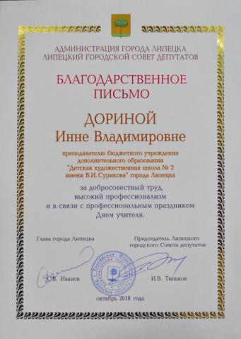 25 октября 2018 года преподаватель Детской художественной школы №2 им. В.И. Сурикова Дорина Инна Владимировна была награждена Благодарственным письмом Администрации города Липецка и Липецкого городского Совета депутатов за добросовестный труд, высокий профессионализм и в связи с профессиональным праздником Днем учителя.