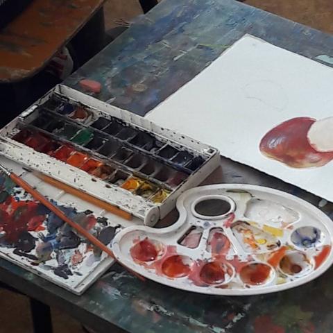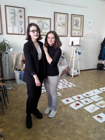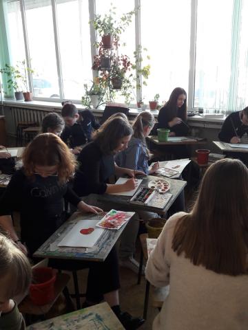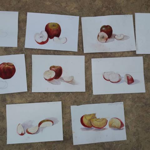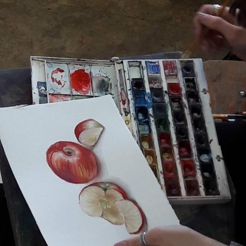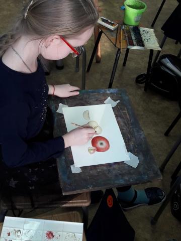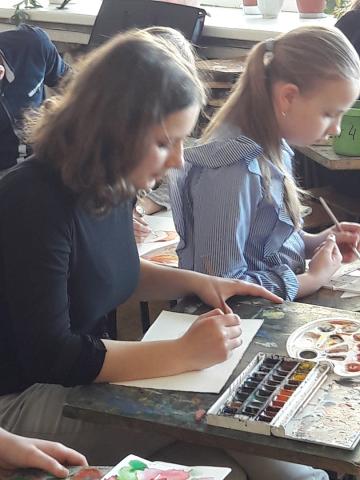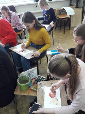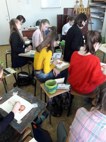 Ученицы ДХШ №2 им. В.И. Сурикова Шершнева Валерия и Полянских Мария, которые совсем недавно вернулись со смены Образовательного центра «Сириус» в городе Сочи, провели мастер-класс по рисованию яблок в технике акварельной живописи для учащихся первого класса. Первоклассники сосредоточенно работали над этюдами, с интересом изучая новый для себя технический подход.