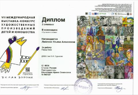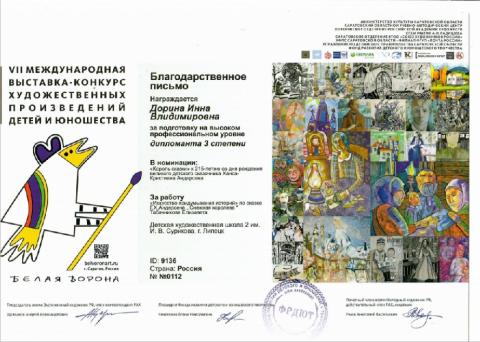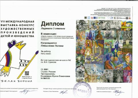 Учащиеся Детской художественной школы №2 им. В.И. Сурикова стали победителями VII Международной выставки-конкурса "Белая ворона", г. Саратов, проведенной Фондом развития детского и юношеского творчества, при поддержке Министерства культуры Саратовской области, Саратовского государственного художественного музея им. Радищева А.Н и др.