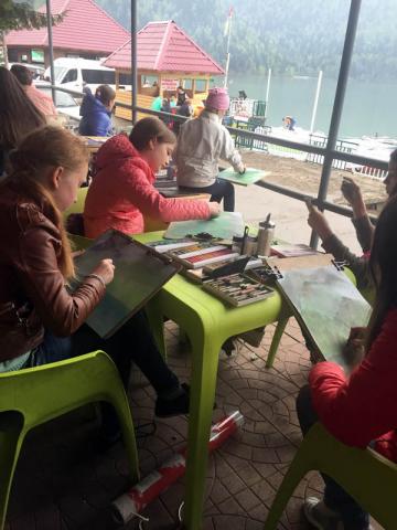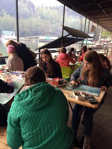 Юные художники много работали. От 4-х до 6-ти часов в день. Основными материалами для работы ребята выбирали пастель, акварель и гуашь. Но также находилось время для знакомства с местной культурой и местных достопримечательностей – пещер Нового Афона, горячих источников, Озера Рица и Набережной Махаджиров.