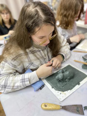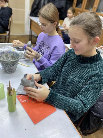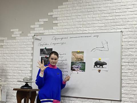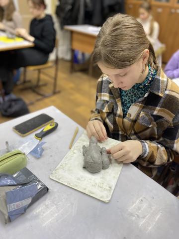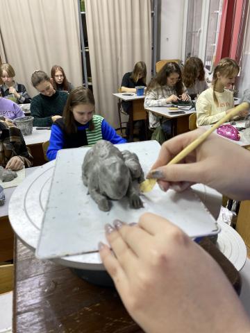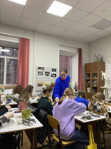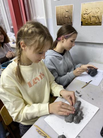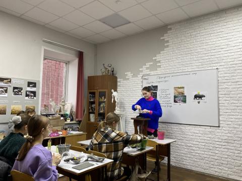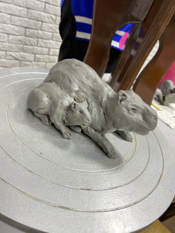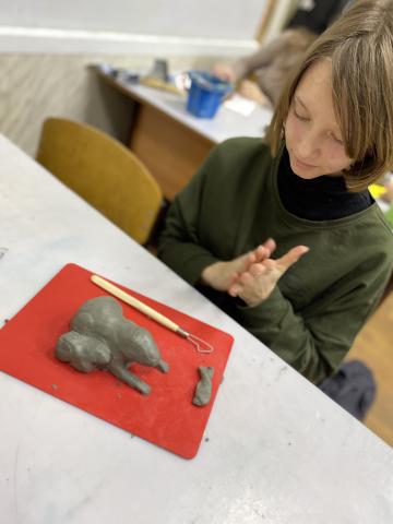 3 четверть у них началась с открытого урока по предмету «Скульптура», преподаватель Монтай Регина Эдуардовна. Тема урока «Двухфазный анималистический этюд. Обрубовка в скульптуре» На уроке ребята познакомились с понятие «Обрубовка» в скульптуре, в ходе урока вывели отличия между понятиями «Этюд» и «Долгосрочная работа». Урок прошел в живой, дружеской обстановке. Заданием было создание скульптуры пары капибар.