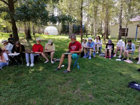Наши две ученицы Плешивова Полина и Бахаева Мария, проходят обучение в рамках ХХ Областного пленэра для одаренных детей, где мастер-классы проводит ведущий преподаватель художественной школы при академиии акварели и изящных искусств (Москва) Сергей Чернышев.