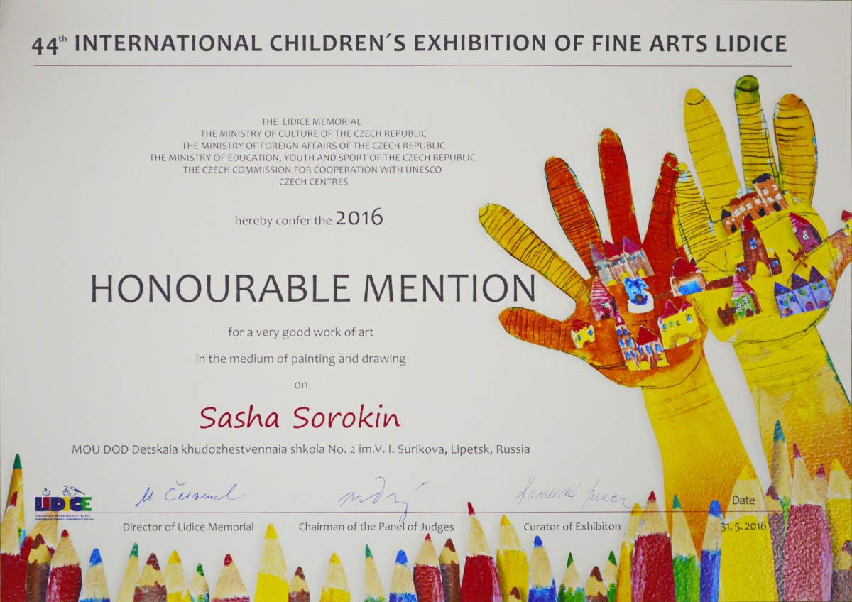 Ученик Детской художественной школы №2 им. В. И. Сурикова Сорокин Александр и его преподаватель - Козлова Светлана Ивановна были удостоены Похвальной Грамоты в 44-ой Международной выставке художественных произведений детей Лидице.